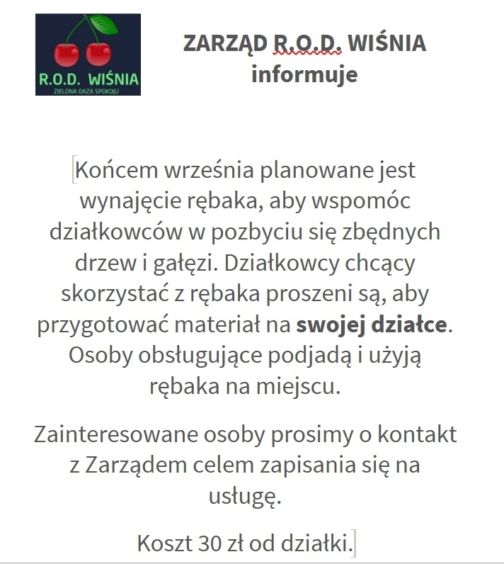 Końcem września planowane jest wynajęcie rębaka, aby wspomóc działkowców w pozbyciu się zbędnych drzew i gałęzi. Działkowcy chcący skorzystać z rębaka proszeni są, aby przygotować materiał na swojej działce. Osoby obsługujące podjadą i użyją rębaka na miejscu.
