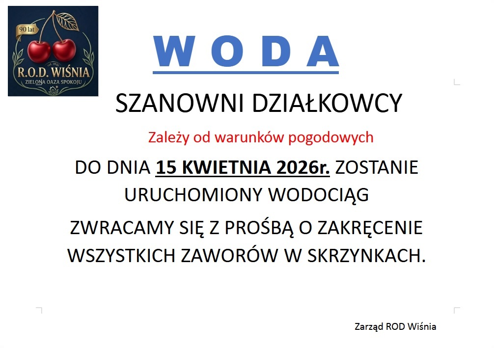 Zanim woda zostanie włączona w sieci ogólnej, prosimy działkowców o sprawdzenie szczelności instalacji na swojej działce i zakręcenie zaworów, aby uniknąć zalania lub wysokich rachunków. Za zużycie wody płaci działkowiec na podstawie wskazań wodomierza.