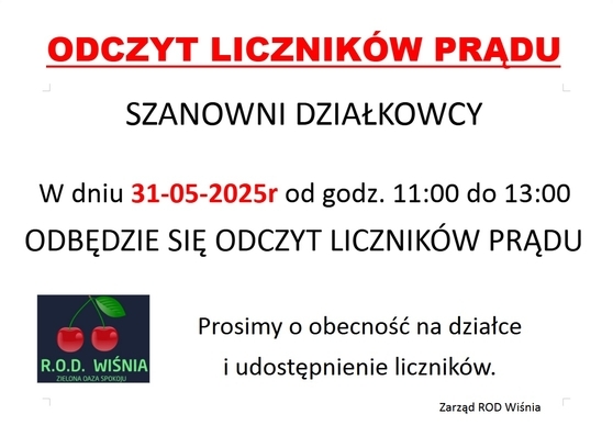 W dniu 31-05-2025r. w godzinach od 11:00 do 13:00 zostanie przeprowadzony komisyjny odczyt liczników energii elektrycznej. Prosimy Działkowców o obecność i umożliwienie odczytu liczników, szczególnie jeśli licznik znajduje się w altanie.