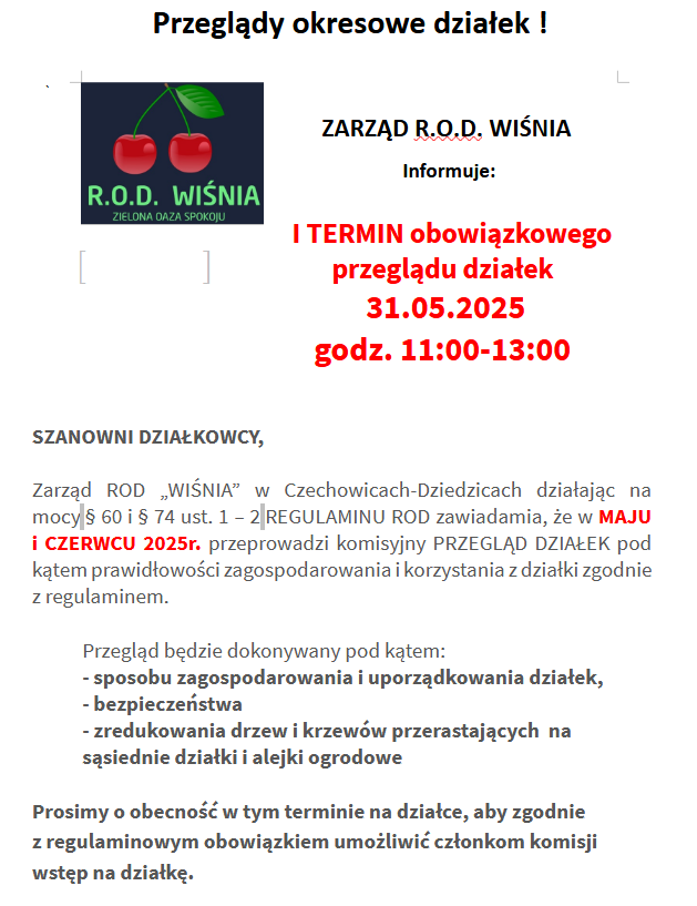 Zarząd ROD WIŚNIA informuje, iż w dniu 31-05-2025r. w godzinach od 11:00 do 13:00 odbędzie się obowiązkowy przegląd działek.