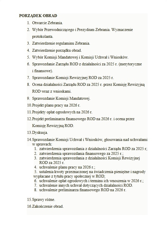 Serdecznie zapraszamy na walne zebranie, które odbędzie się w dniu 25 kwietnia 2026r. o godzinie 14:00 w Domu Działkowca R.O.D. "Wiśnia" i poświęcone będzie omówieniu bardzo ważnych spraw dotyczących naszego ogrodu.